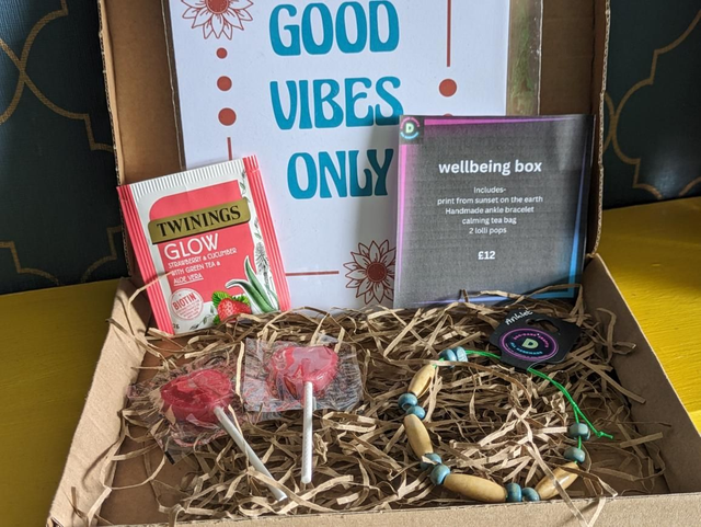 Wellbeing box. Includes jewellery, print, tea bags and lollipop